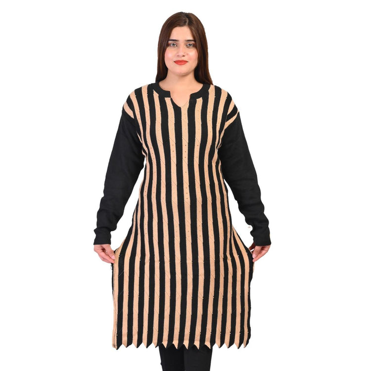 Product Name: Women's Woolen Stripe Full Sleeves Kurti Package Contains: 1 Piece of Kurti Fabric: Woolen Kurti Color: Black & Skin Work: Stripe Size: Freesize fits upto XXl(42) Kurti Stitched Type: Stitched Weight: 200